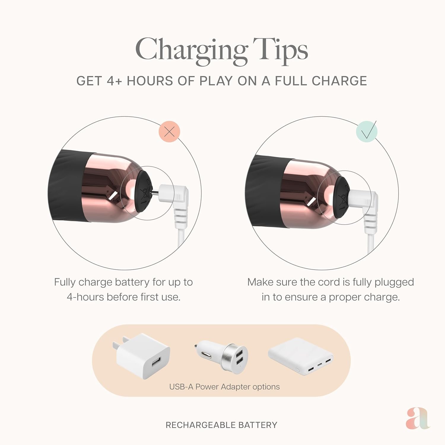 Una batería a la altura de tus necesidades: Con una batería recargable líder en la industria que dura más de 4 horas, este juguete sexual para parejas está diseñado para tu pareja o incluso para tus sesiones de preliminares y orgasmos más largas. Recárgalo fácilmente con el cargador USB incluido. Función de encendido/apagado rápido: Presiona el botón de encendido una vez para encenderlo y otra vez para apagarlo. *No funciona mientras está enchufado y cargando.